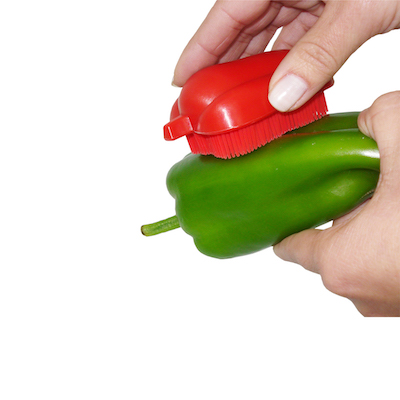 Escova para alimentos com cerdas macias e anatômica, em formato de pimentão deixando sua cozinha muito mais divertida! Sugestão de uso: serve para lavar verduras, frutas e legumes, com facilidade de remoção das sujeiras e agrotóxicos, de forma prática e rápida.